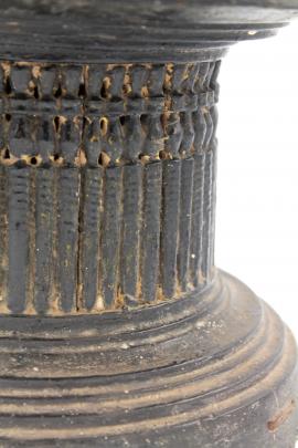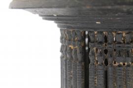 ขนาด : ส. 23.0 ซม. ก. 30.8 ซม. / ลักษณะทางกายภาพ : มีลักษณะเป็นพานทำจากไม้ มีการแกะสลักไม้เล็กๆ แล้วนำมาประกอบติดกันเพื่อทำเป็นที่จับ ในส่วนของฐานก็มีการแกะสลักเป็นขั้นๆ ลดหลั่นกันลงไปจนถึงปลายของฐาน มีร่องรอยหักบิ่นบริเวณปากพานและไม้แกะสลักเล็กๆ ที่ทำเป็นที่จับบางอันได้หลุดหายไป