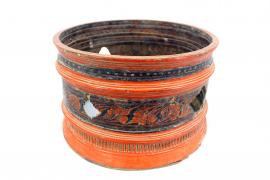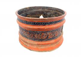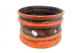 ขนาด : ส. 19.0 ซม. ก. 31.5 ซม. / ลักษณะทางกายภาพ : มีลักษณะเป็นฝาครอบขันหมากที่ทำจากไม้มีการลงรักหาง (ชาด) มีการแกะสลักเป็นชั้นๆ และวาดลวดลายประดับเป็นรูปคล้ายใบไม้บริเวณตรงกลางของฝาครอบ สีบางส่วนได้ถลอกออกไป มีร่องรอยชำรุดแตกหักบริเวณตรงกลางของฝาครอบที่มีการวาดลวดลาย