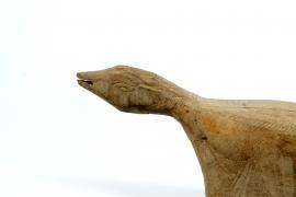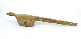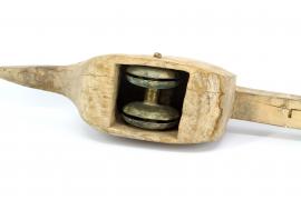 ขนาด : ย. 90.1 ซม. ส. 12.5 ซม. น. 10.3 ซม. / ลักษณะทางกายภาพ : ทำจากไม้ด้านหนึ่งแกะสลักเป็นรูปสัตว์ชนิดหนึ่งข้างใต้เจาะเป็นโพรงเอาไว้ใส่ลูกลอกที่ทำจากทองเหลืองมีแกนเหล็กเสียบสลักไว้ ส่วนอีกด้านหนึ่งที่ต่อจากรูปสลักสัตว์เป็นด้ามยาวประมาณสองศอกมีรอยเชื่อมต่อตรงกลางตรงปลายมีการเจาะรูไว้ใส่สลัก