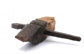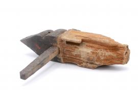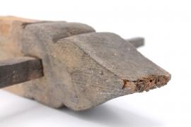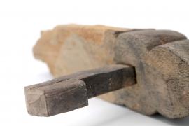 ขนาด : ย. 24.2 ซม. ก. 23.5 ซม. / ลักษณะทางกายภาพ : ทำจากไม้มีรอยสองหยักและปลายแหลมเป็นรูปดอกบัว วัดเข้ามาประมาณหนึ่งฝ่ามือมีการเจาะรูแล้วมีลิ้มไม้ตอกอยู่เคลือบไม้ด้วยยางรัก ส่วนตรงโคนมีล่องรอยการทำลายของปลวก