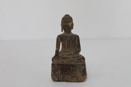 แกะสลักจากไม้ ปางมารวิชัย นั่งขัดสมาธิราบ ชายพระสังฆาฎิยาวจรดพระนาภี เส้นพระเกศาเรียงเป็นรูปทรงสามเหลี่ยม พระรัศมีดอกบัวตูม พระเนตรหลบต่ำ พระเนตรด้านขวาถูกกะเทาะหายไป ติ่งพระกรรณข้างขวาชำรุด นั่งบนฐานเขียงสูง ตรงก้นมีรูใช้สำหรับยึดตอนแกะสลัก