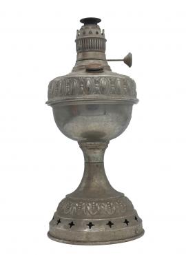 ตะเกียงชิ้นนี้ เป็นตะเกียงทรงสูง ฐานกว้าง ขาตั้งเรียว ลำตัวอ้วนกลมซึ่งเป็นถึงเก็บเชื้อเพลิง แล้วค่อยเรียวเล็กลงทางด้านบนซึ่งเป็นหัวจ่ายไฟ มีวาล์วปรับความแรงไฟ ทำด้วยเหล็กอย่างบาง เกะสลักลวดลายโดยรอบ มีช่องใส่เชื้อเพลิง มีขนาด สูง 28.8 เซนติเมตร ฐานมี