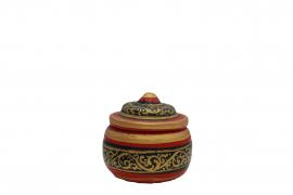 ผอบชิ้นนี้ เป็นผอบไม้ขนาดเล็ก มีฝาปิด ฝามีจุกแหลมสำหรับจับ ลำตัวอ้วนกลมแกะสลักลวดลายดอกไม้ ลงสีชาดและรัก บริเวณลายดอกไม้จะปิดทอง มีขนาด สูง 7.5 เซนติเมตร ปาก มีขนาดเส้นผ่านศูนย์กลาง 6 เซนติเมตร ฐานมีขนาดเส้นผ่านศูนย์กลาง 7 เซนติเมตร