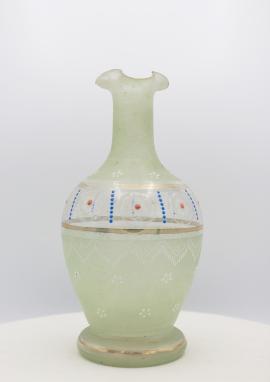 แจกันแก้ว ใช้สำหรับใส่ดอกไม้ตกแต่งบ้าน หรือวางประดับธรรมดาก็ได้ ชิ้นนี้ทำจากแก้วเนื้อใสสีเขียวมรกต ลำตัวประดับลายดอกไม้สีน้ำเงิน