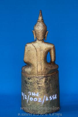 พระพุทธรูปไม้แกะสลัก ลงรักปิดทอง ... มีข้อความจารึกตรงฐาน ดังนี้ "สัทธาน้อยชินาเปนเคล้า พร้อมกับด้วยภริยา..."
