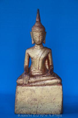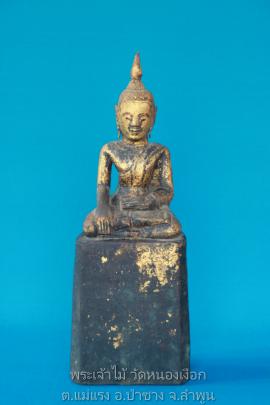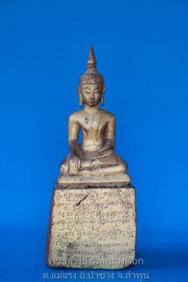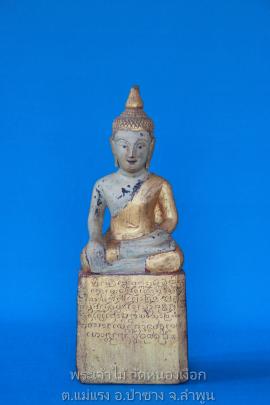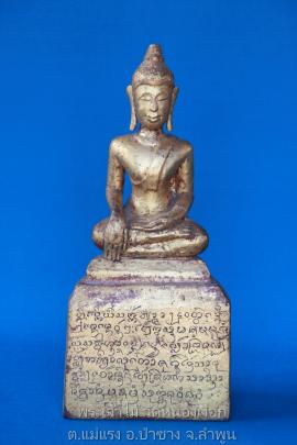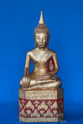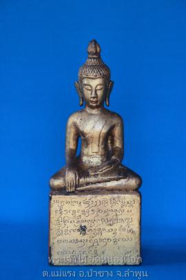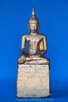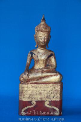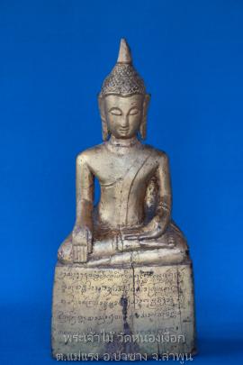 พระพุทธรูปไม้แกะสลัก ลงรักปิดทอง ... มีข้อความจารึกตรงฐาน ดังนี้ "สัทธาน้อยชินาเปนเคล้า พร้อมกับด้วยภริยา..."