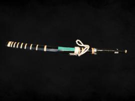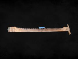 มีลักษณะรูปทรงยาวตรงกลางแหลมคม มีรอยหยัก มีด้ามจับทั้งบนและล่างทำมาจากไม้